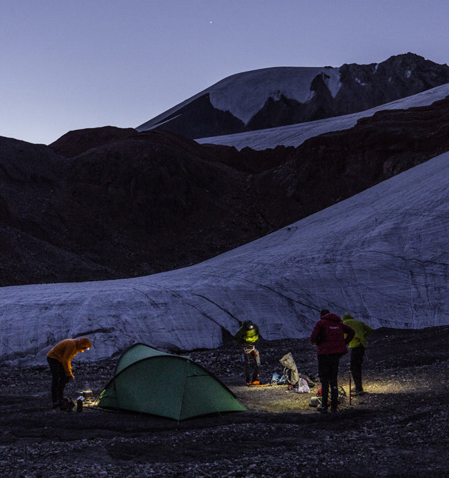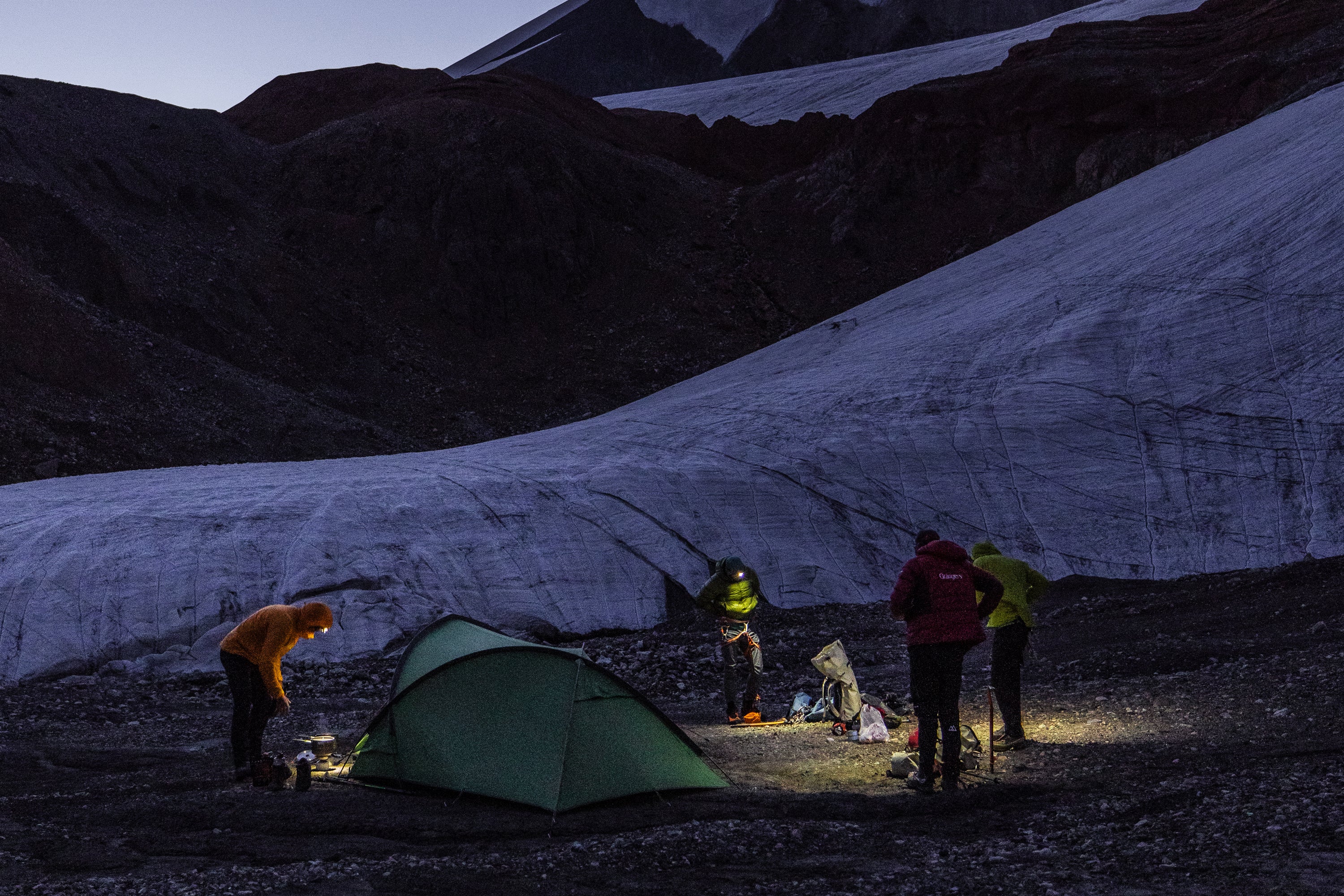 We did not linger. Clouds built, the snow softened, and we retraced the ridge, jumping the same crevasse on a tight rope before working back across the glacier. We stopped at Camp 1 to collect our cache and carried on to ABC. By the time the tents came into view it was raining. I dropped my pack, half crawled into my bag with boots still on, and let the day finally catch up with me.
