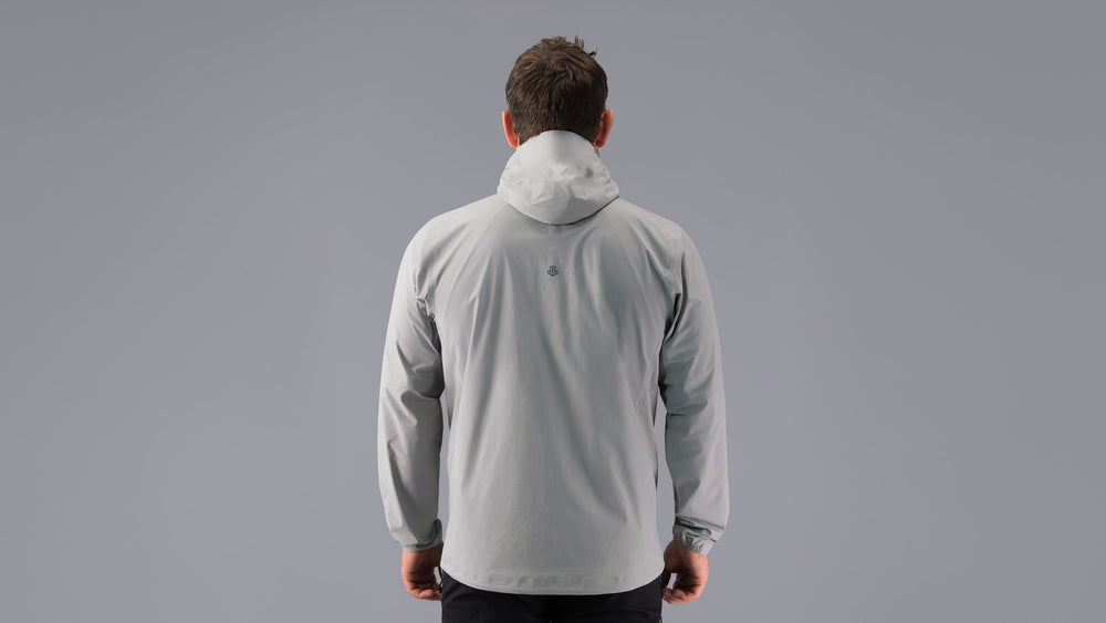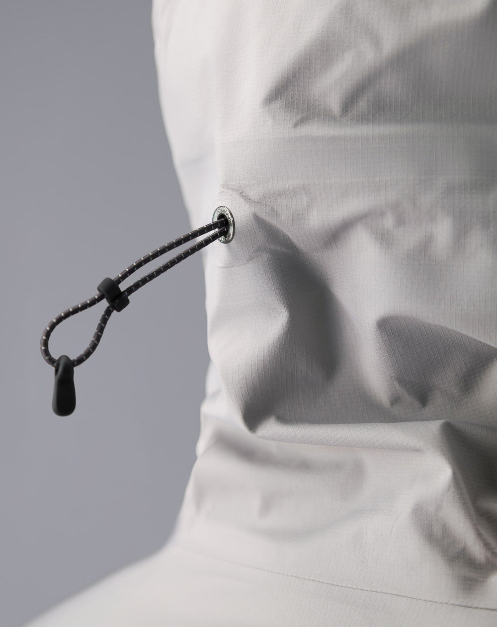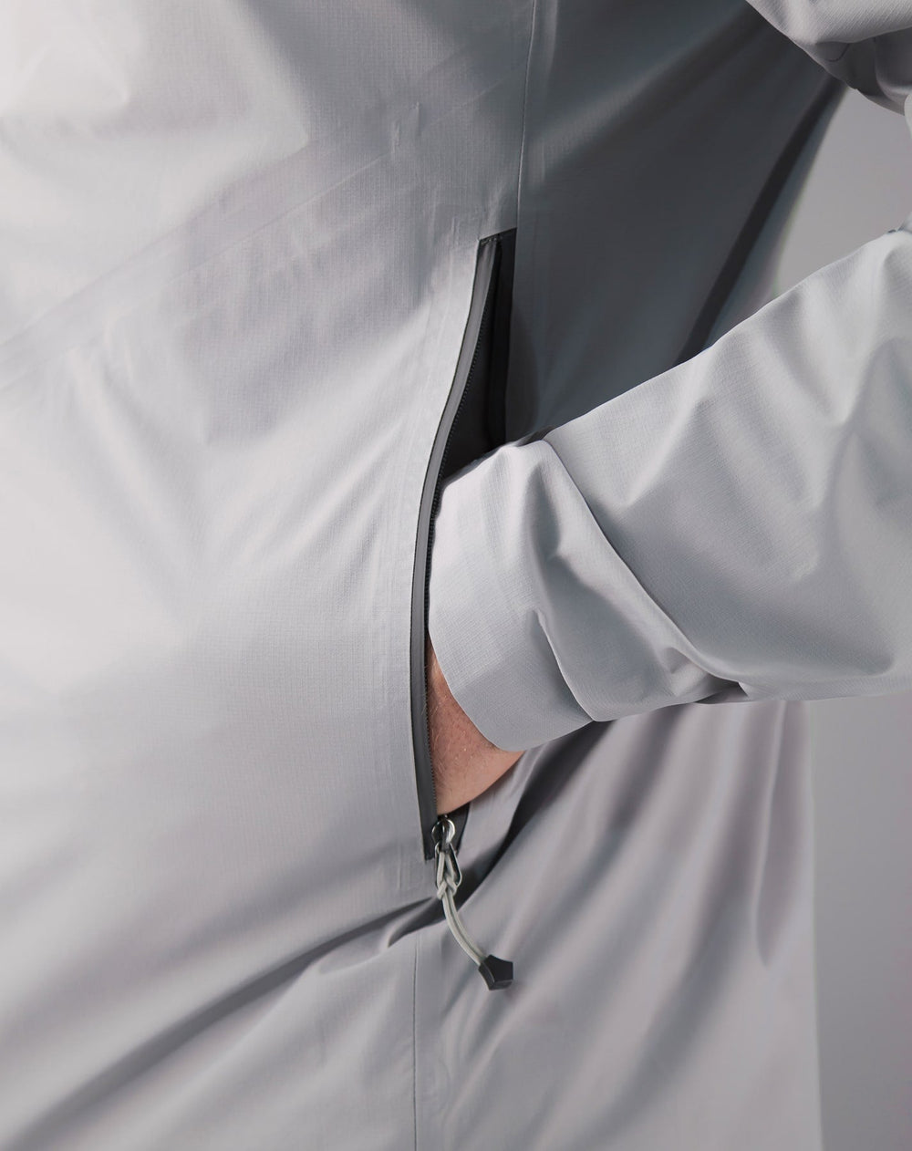 A close, athletic cut keeps bulk to a minimum, while articulated sleeves and a scoop drop hem move with the body. A storm hood with mouldable peak locks down vision when the weather breaks. Pre-elasticated cuffs, low-profile hem adjusters, and AquaGuard® waterproof zips seal out the elements without excess.