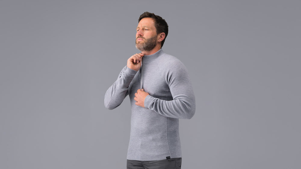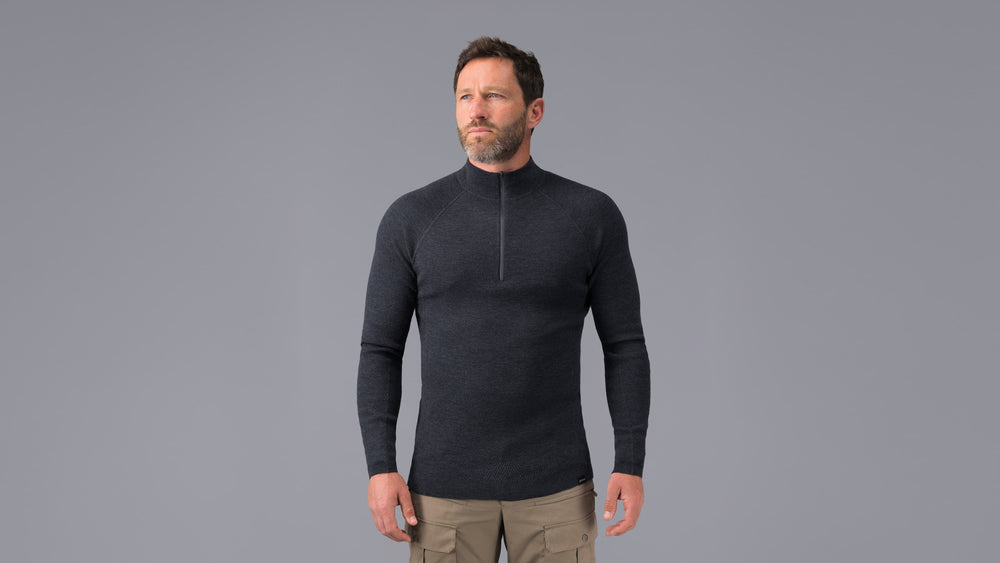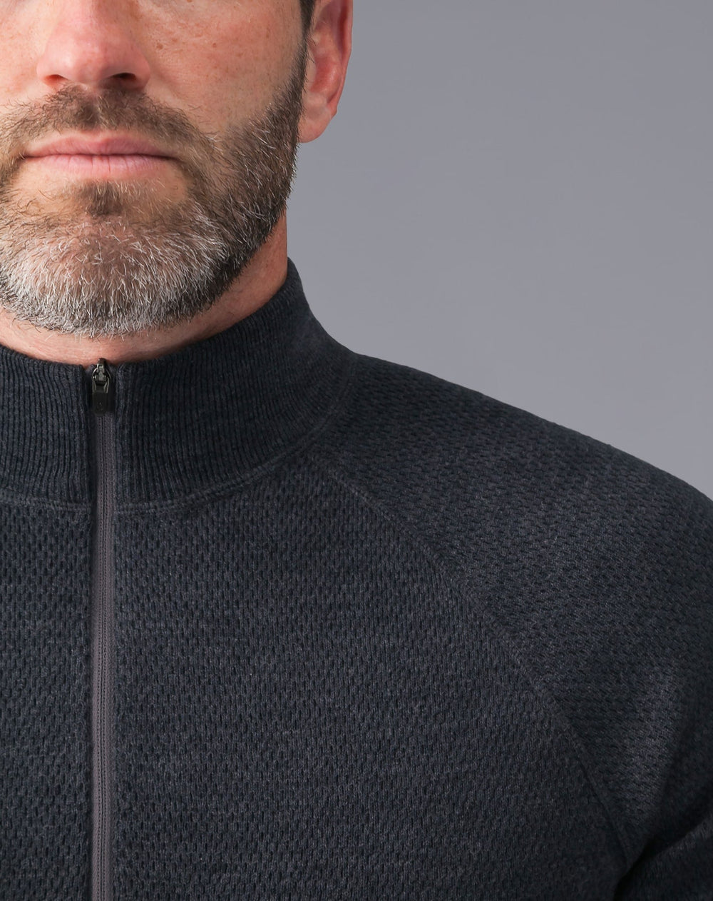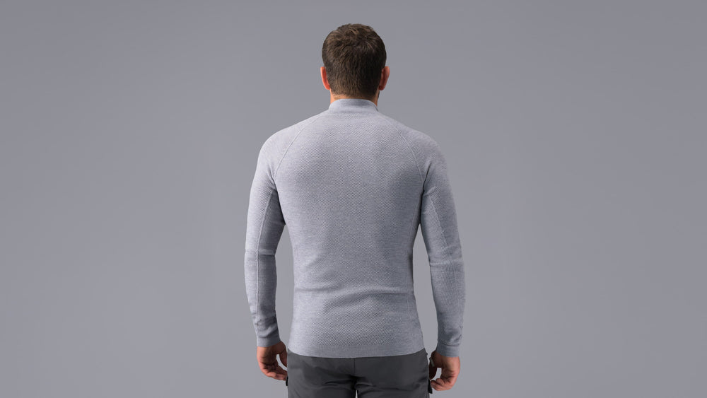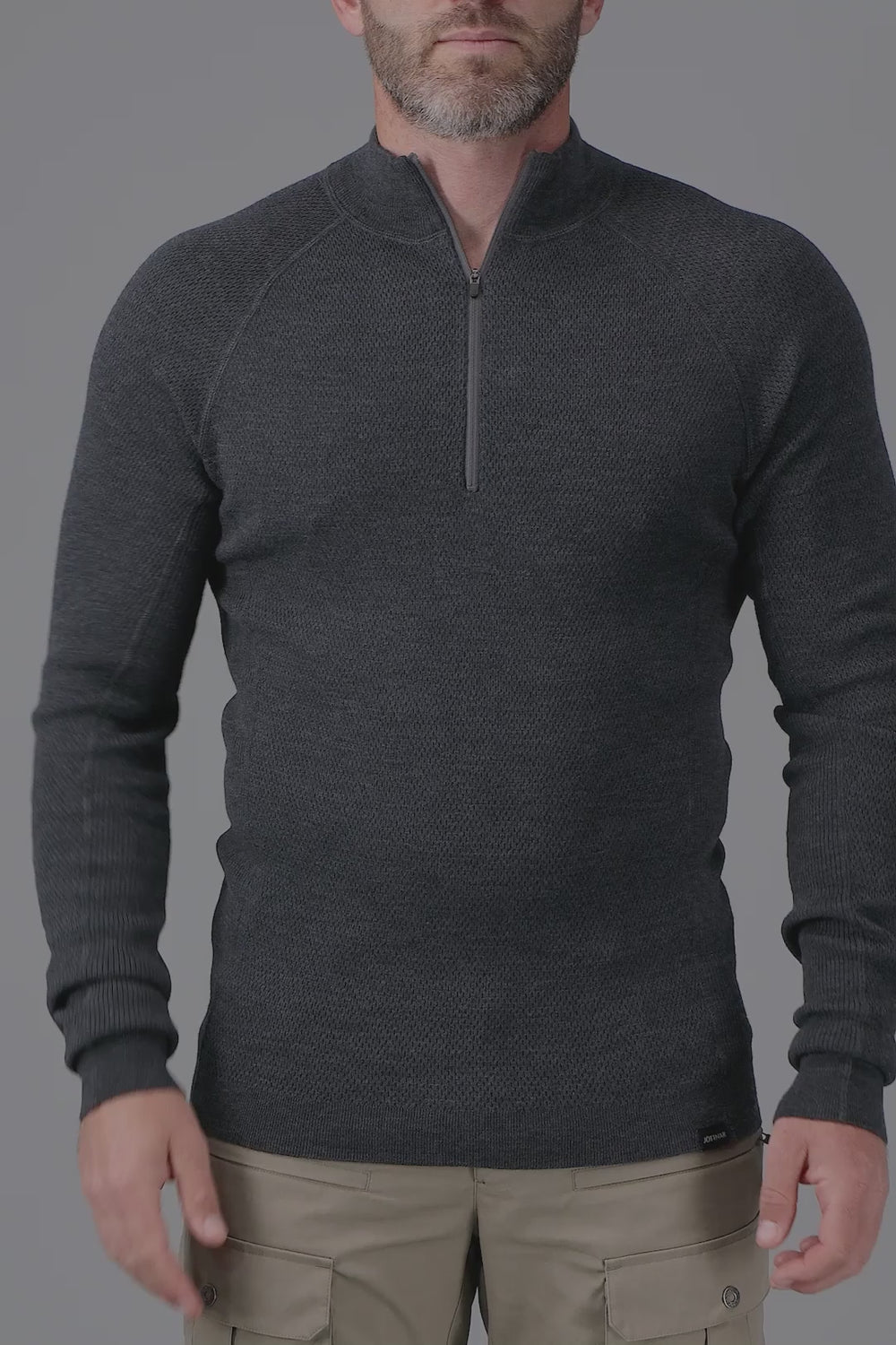 Core-spun yarn technology adds stretch, strength, and faster drying. Body-mapped pointelle panels boost airflow through sides and underarms. A double-layered rib collar blocks wind, while ribbed cuffs seal in warmth. Finished with a reverse coil, auto-lock YKK® quarter zip.
