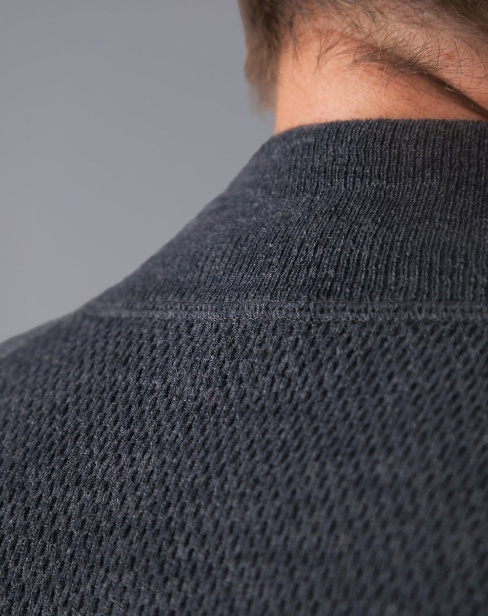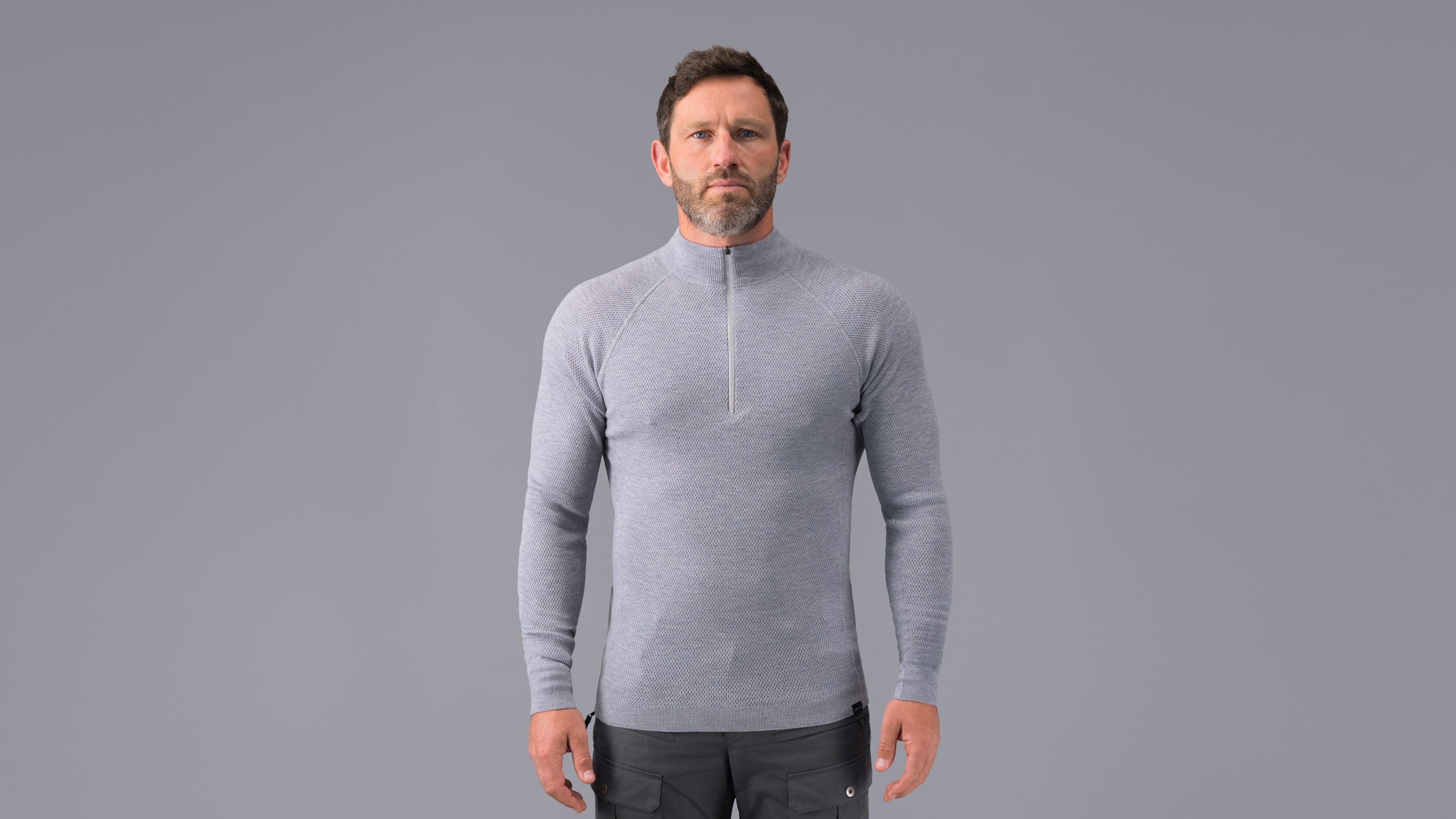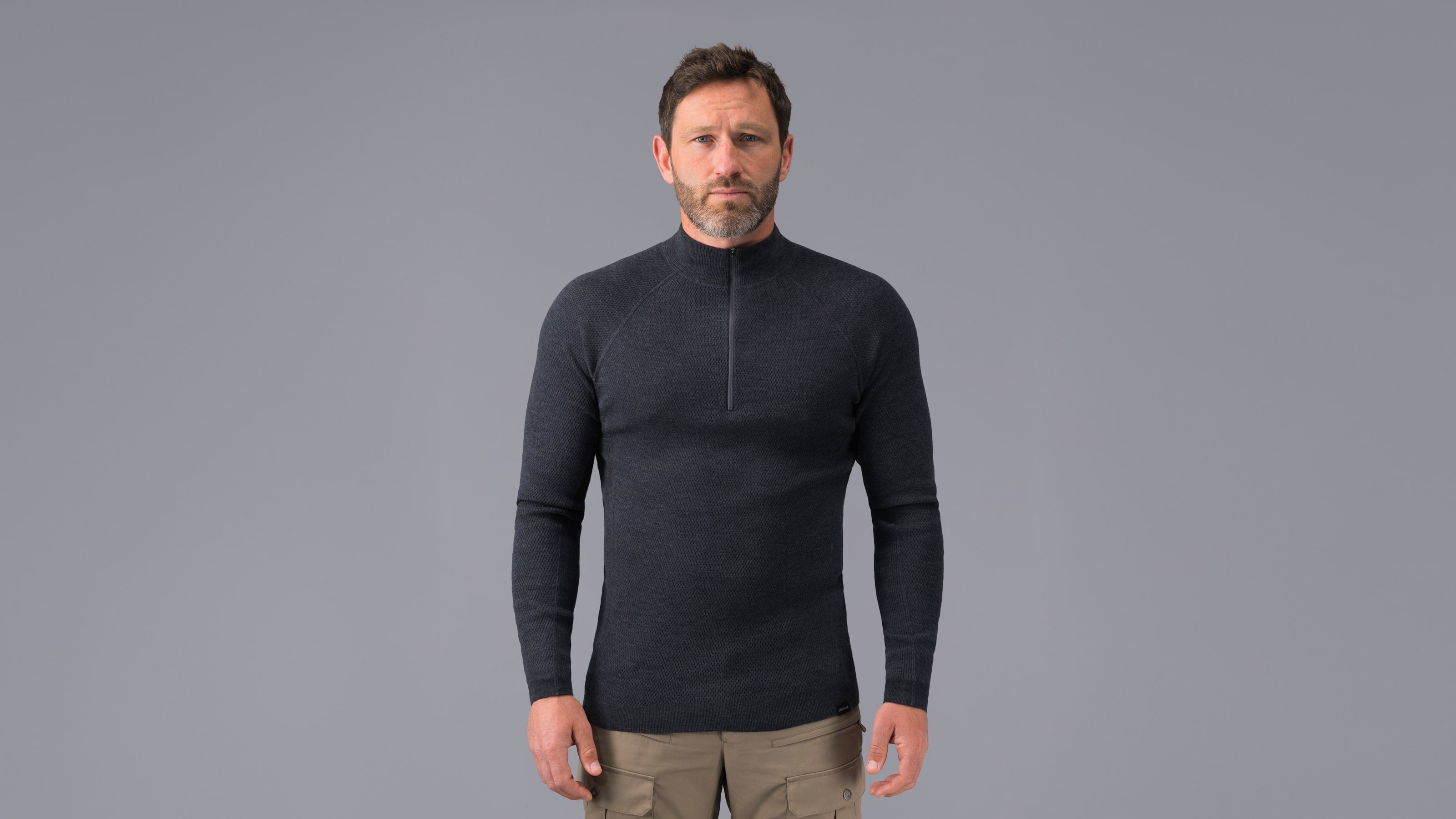 Core-spun yarn technology adds stretch, strength, and faster drying. Body-mapped pointelle panels boost airflow through sides and underarms. A double-layered rib collar blocks wind, while ribbed cuffs seal in warmth. Finished with a reverse coil, auto-lock YKK® quarter zip.